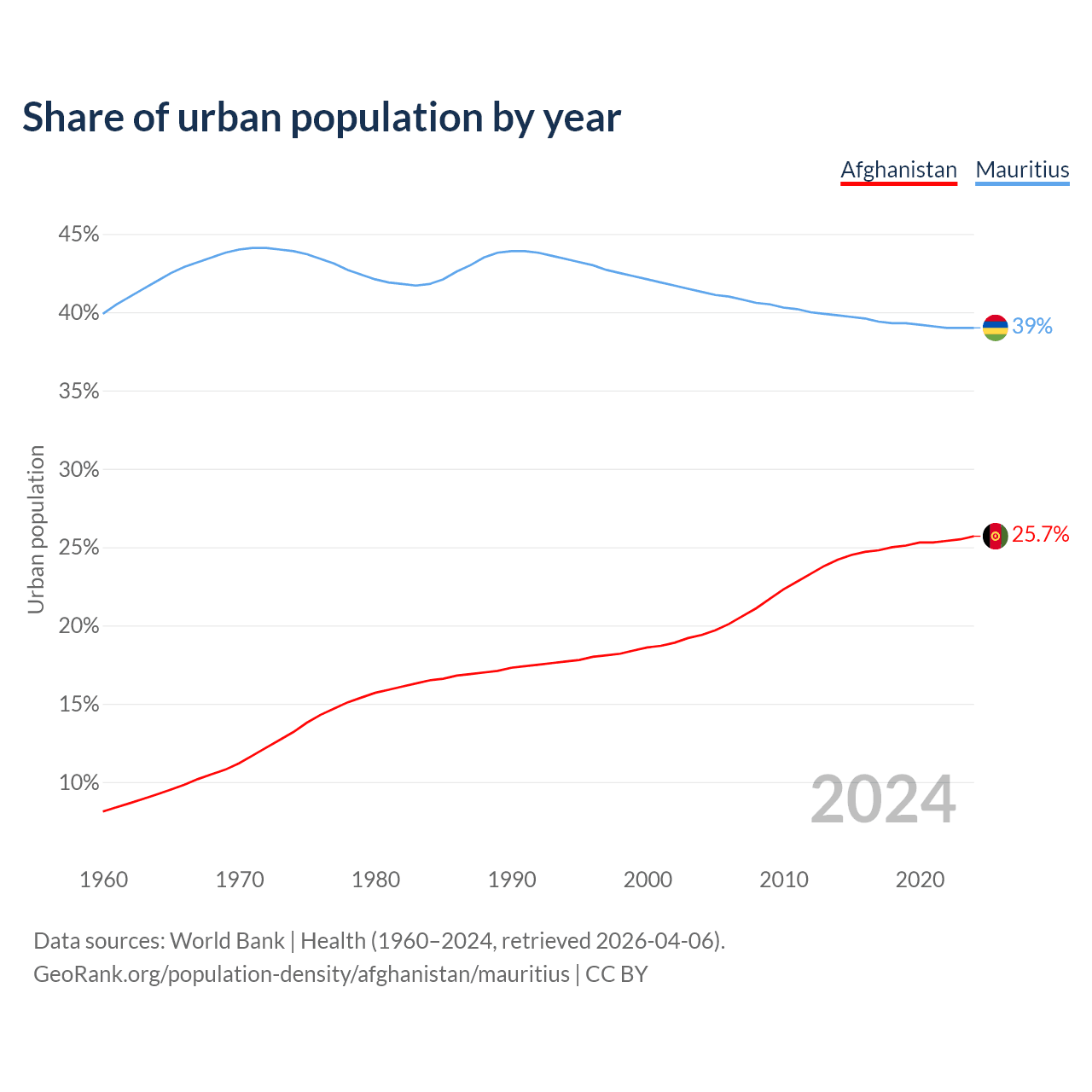 From 2004 to 2024, the share of urban population changed from 19.4% to 25.7% in Afghanistan and from 41.3% to 39% in Mauritius.