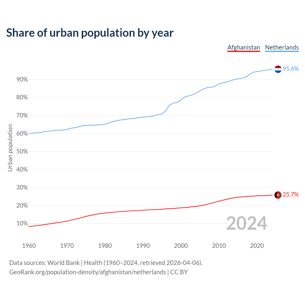 From 2004 to 2024, the share of urban population changed from 19.4% to 25.7% in Afghanistan and from 82.3% to 95.6% in the Netherlands.