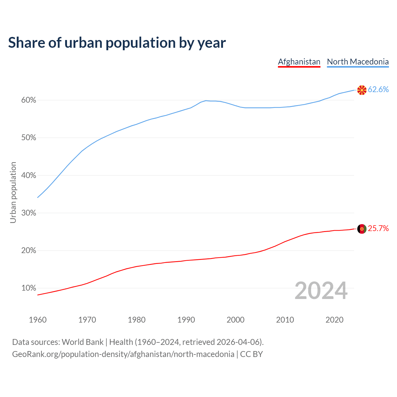 From 2004 to 2024, the share of urban population changed from 19.4% to 25.7% in Afghanistan and from 57.9% to 62.6% in North Macedonia.