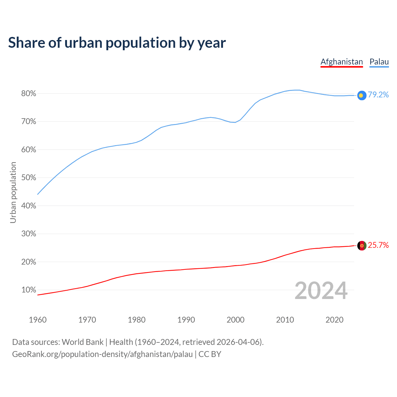 From 2004 to 2024, the share of urban population changed from 19.4% to 25.7% in Afghanistan and from 76.4% to 79.2% in Palau.
