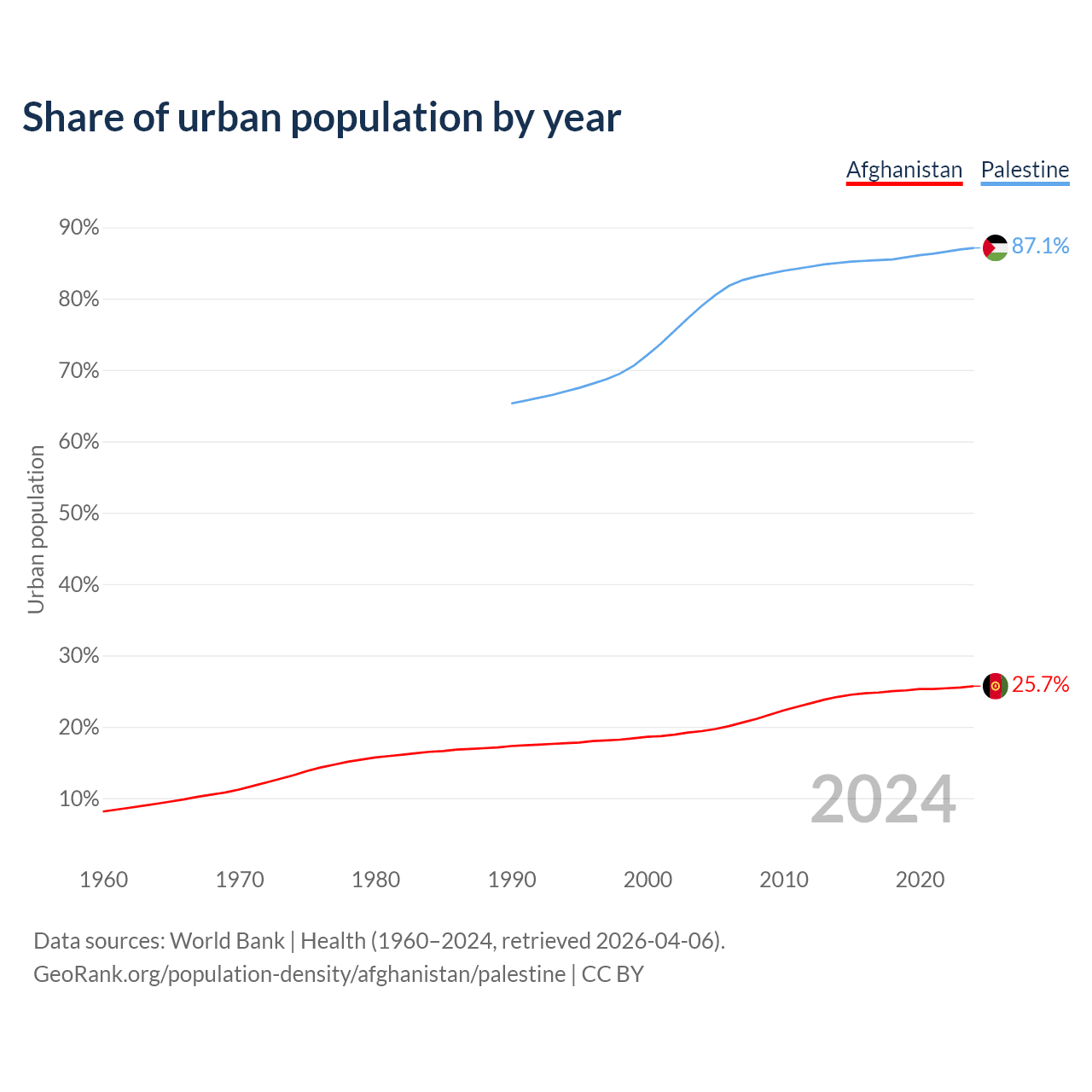 From 2004 to 2024, the share of urban population changed from 19.4% to 25.7% in Afghanistan and from 79% to 87.1% in Palestine.