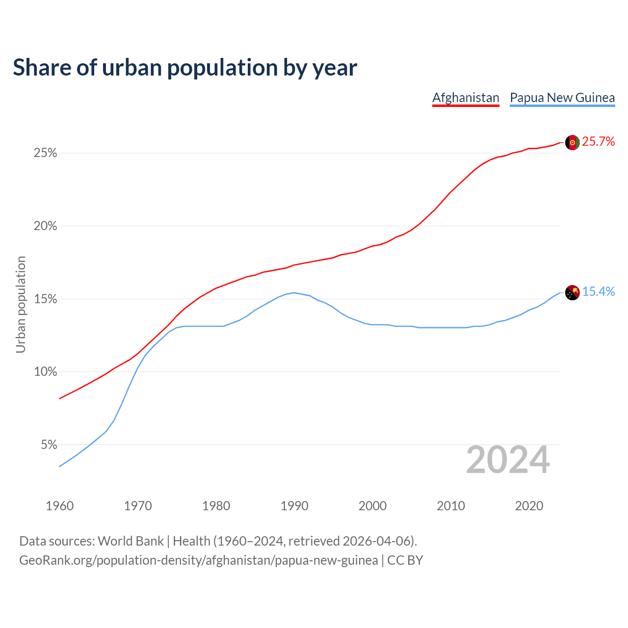 From 2004 to 2024, the share of urban population changed from 19.4% to 25.7% in Afghanistan and from 13.1% to 15.4% in Papua New Guinea.