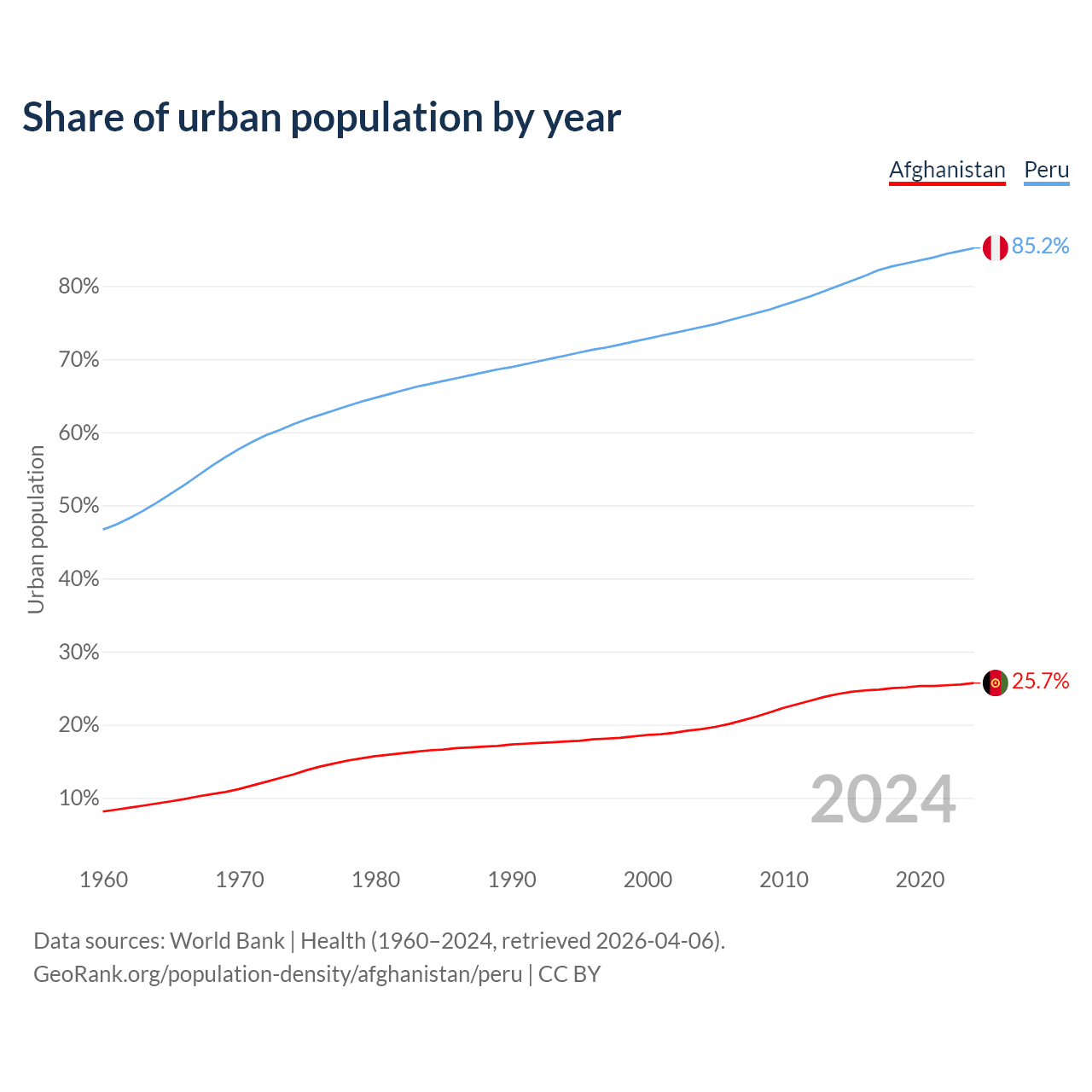 From 2004 to 2024, the share of urban population changed from 19.4% to 25.7% in Afghanistan and from 74.4% to 85.2% in Peru.
