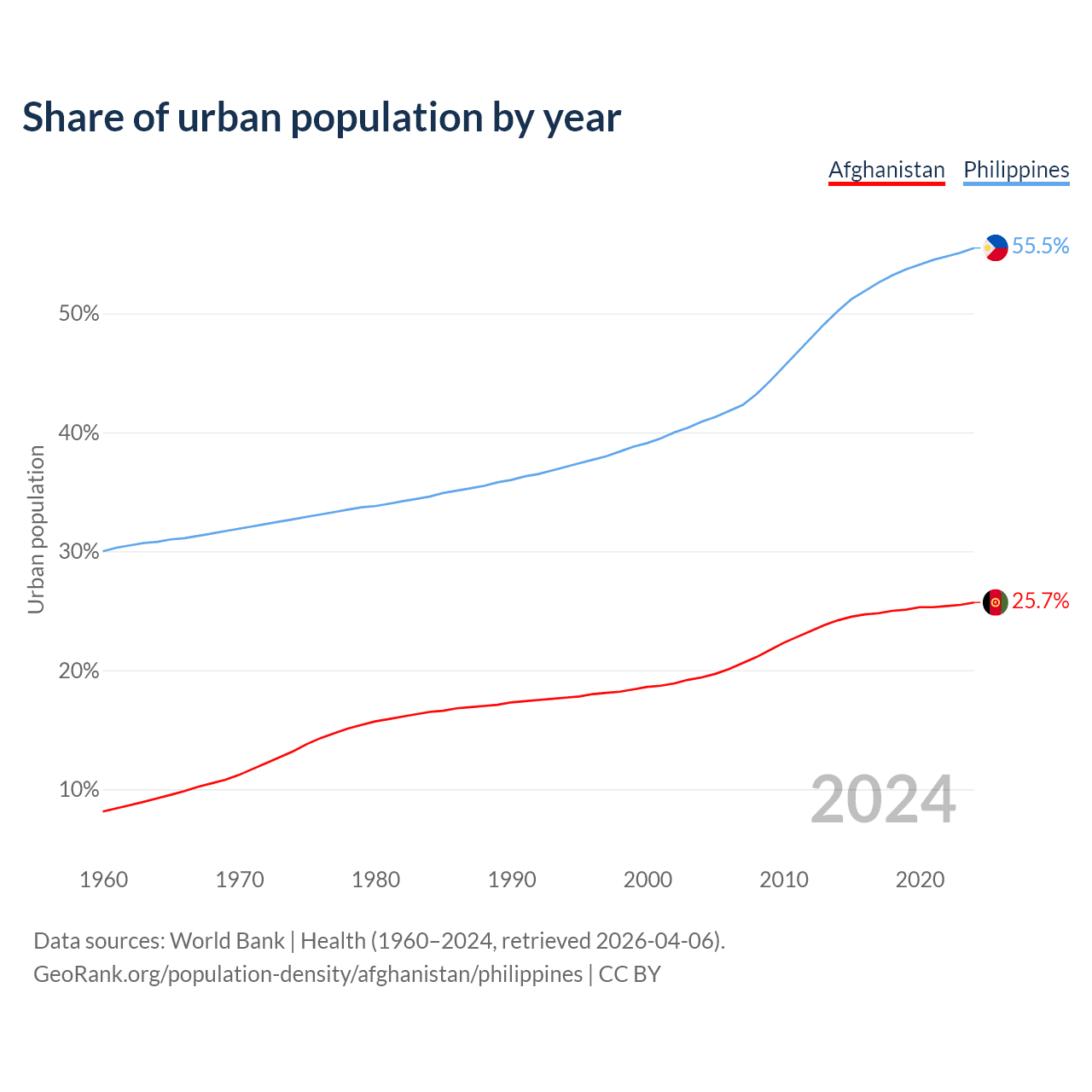 From 2004 to 2024, the share of urban population changed from 19.4% to 25.7% in Afghanistan and from 40.9% to 55.5% in the Philippines.