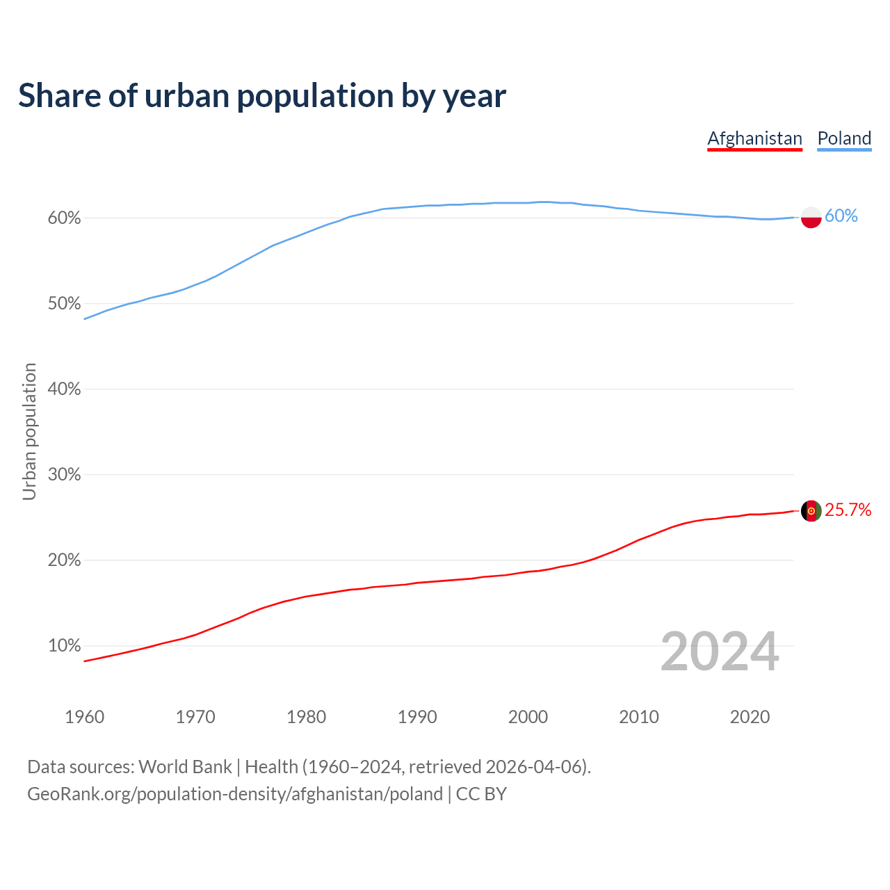 From 2006 to 2026, population density in Afghanistan increased by 77.3%, compared to a 6.1% decline in Poland.