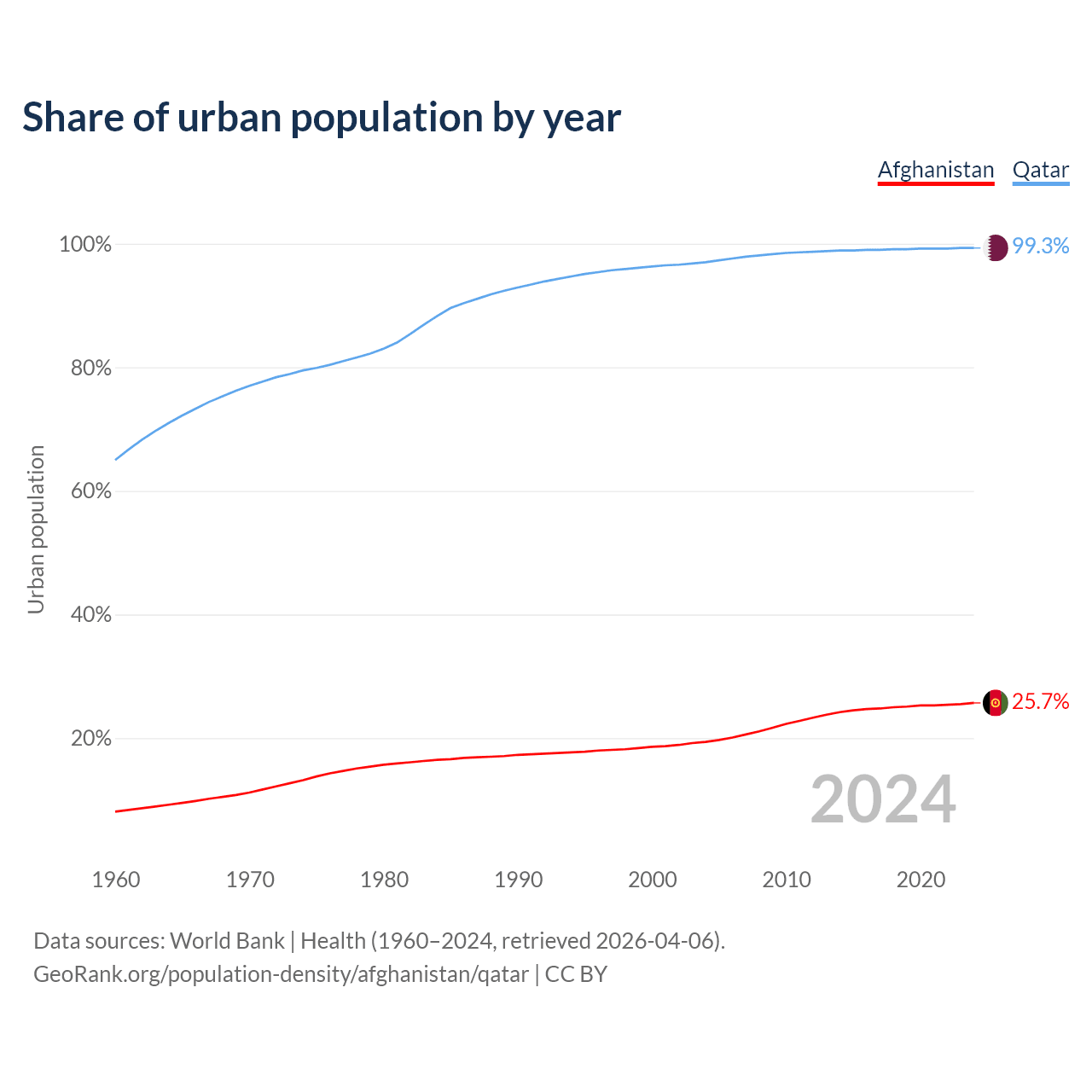 From 2004 to 2024, the share of urban population changed from 19.4% to 25.7% in Afghanistan and from 97% to 99.3% in Qatar.