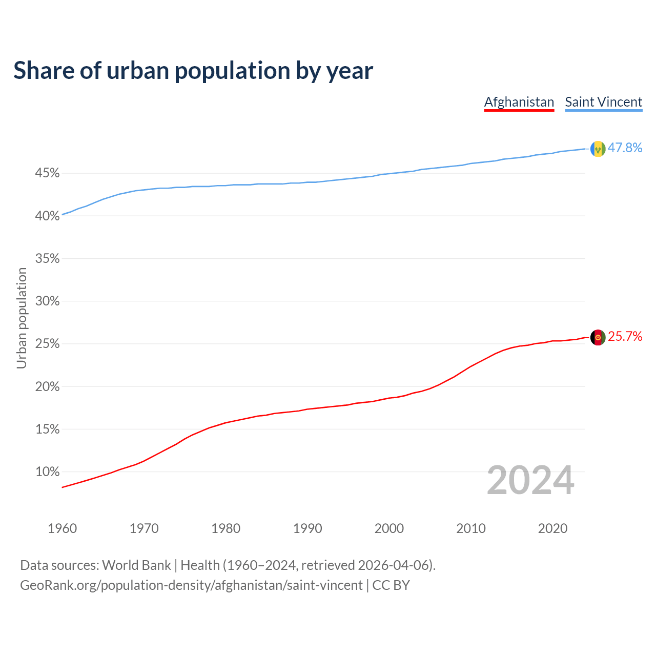 From 2004 to 2024, the share of urban population changed from 19.4% to 25.7% in Afghanistan and from 45.4% to 47.8% in Saint Vincent.