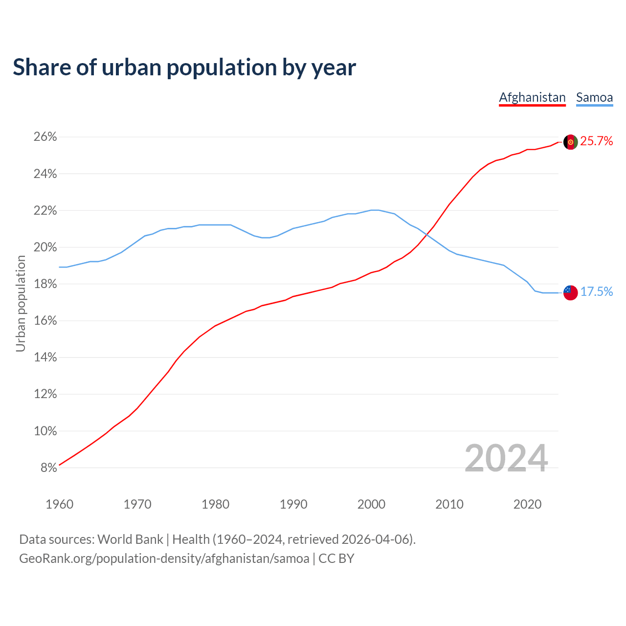 From 2006 to 2026, population density in Afghanistan increased by 77.3%, compared to a 19.6% growth in Samoa.