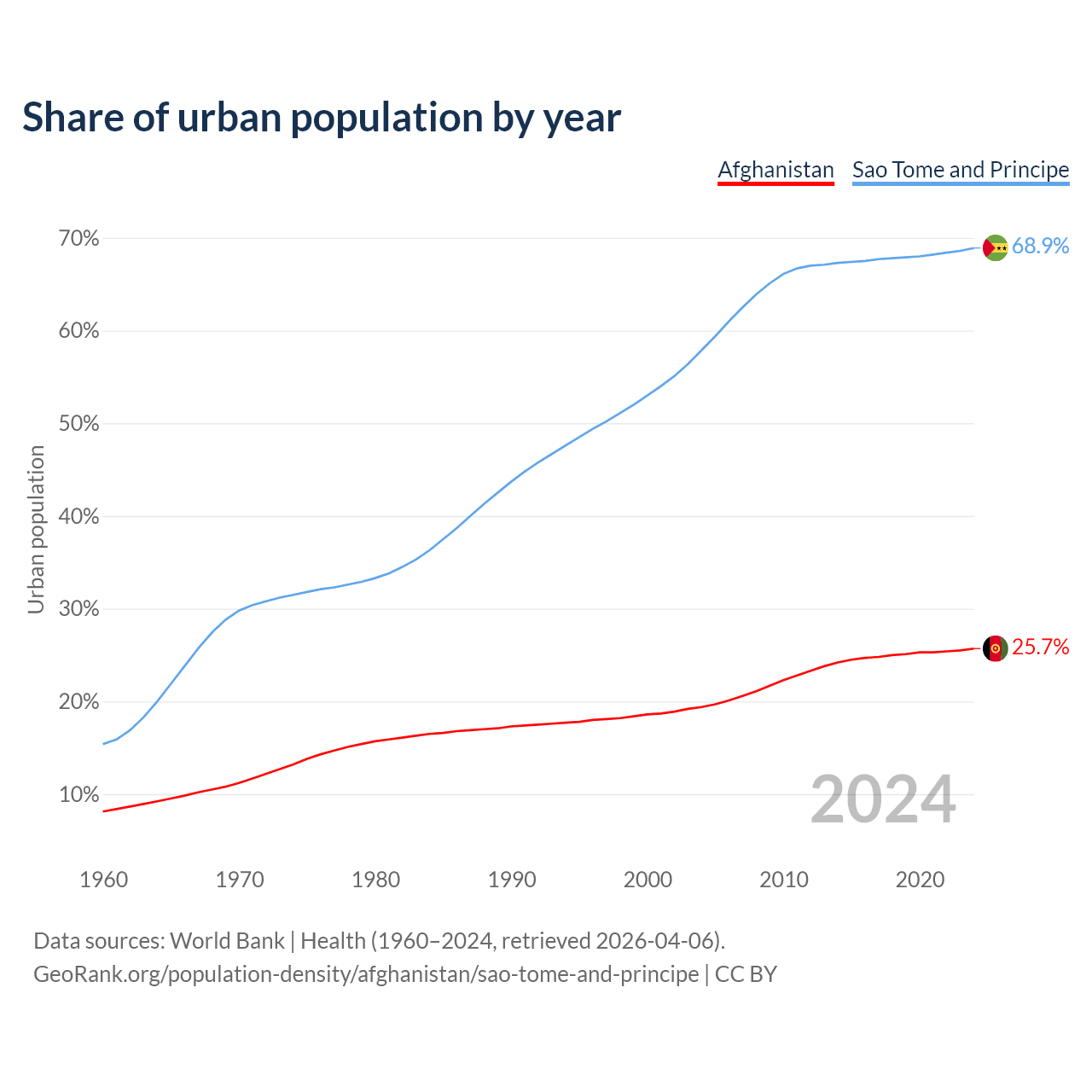 From 2004 to 2024, the share of urban population changed from 19.4% to 25.7% in Afghanistan and from 57.9% to 68.9% in Sao Tome and Principe.