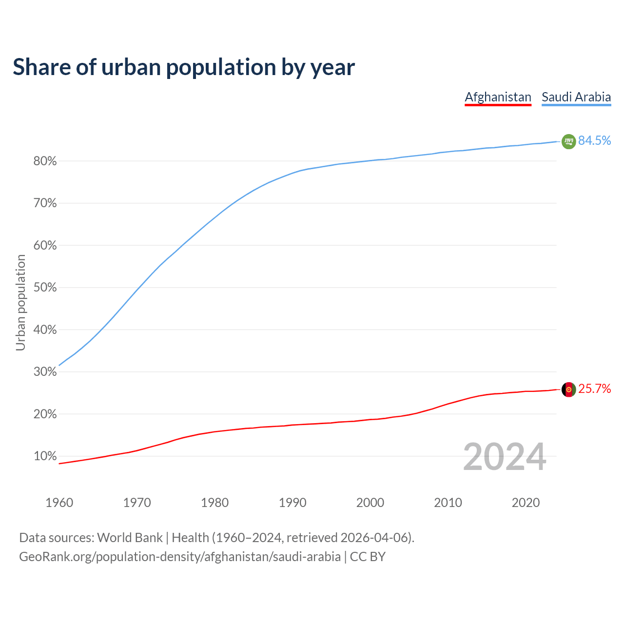 From 2004 to 2024, the share of urban population changed from 19.4% to 25.7% in Afghanistan and from 80.8% to 84.5% in Saudi Arabia.
