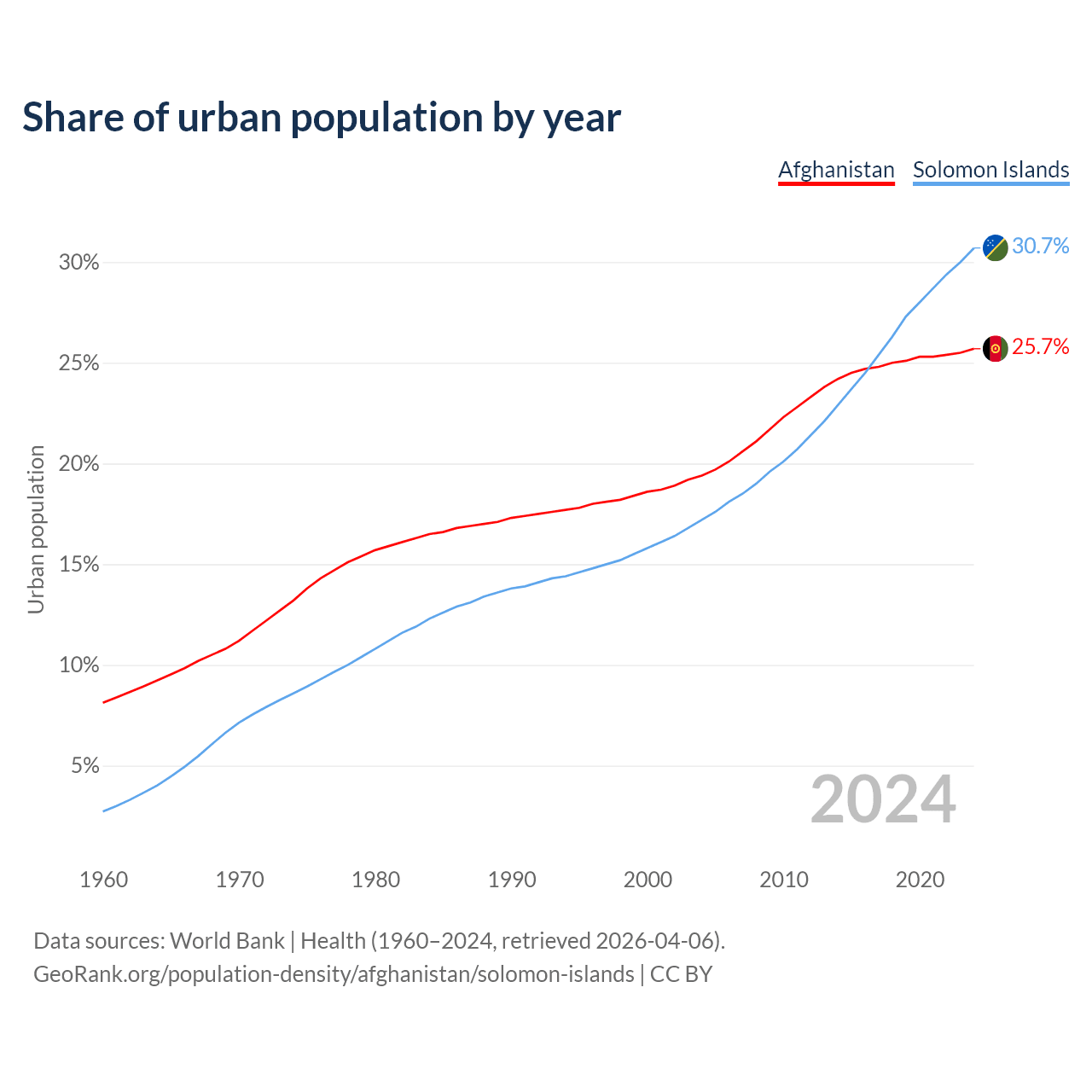 From 2004 to 2024, the share of urban population changed from 19.4% to 25.7% in Afghanistan and from 17.2% to 30.7% in the Solomon Islands.