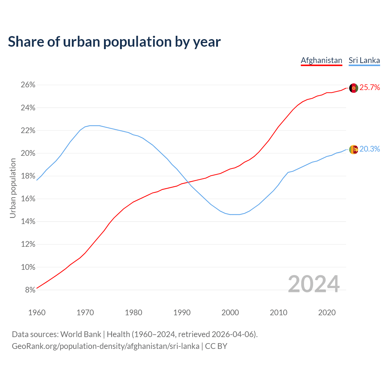 From 2004 to 2024, the share of urban population changed from 19.4% to 25.7% in Afghanistan and from 14.9% to 20.3% in Sri Lanka.