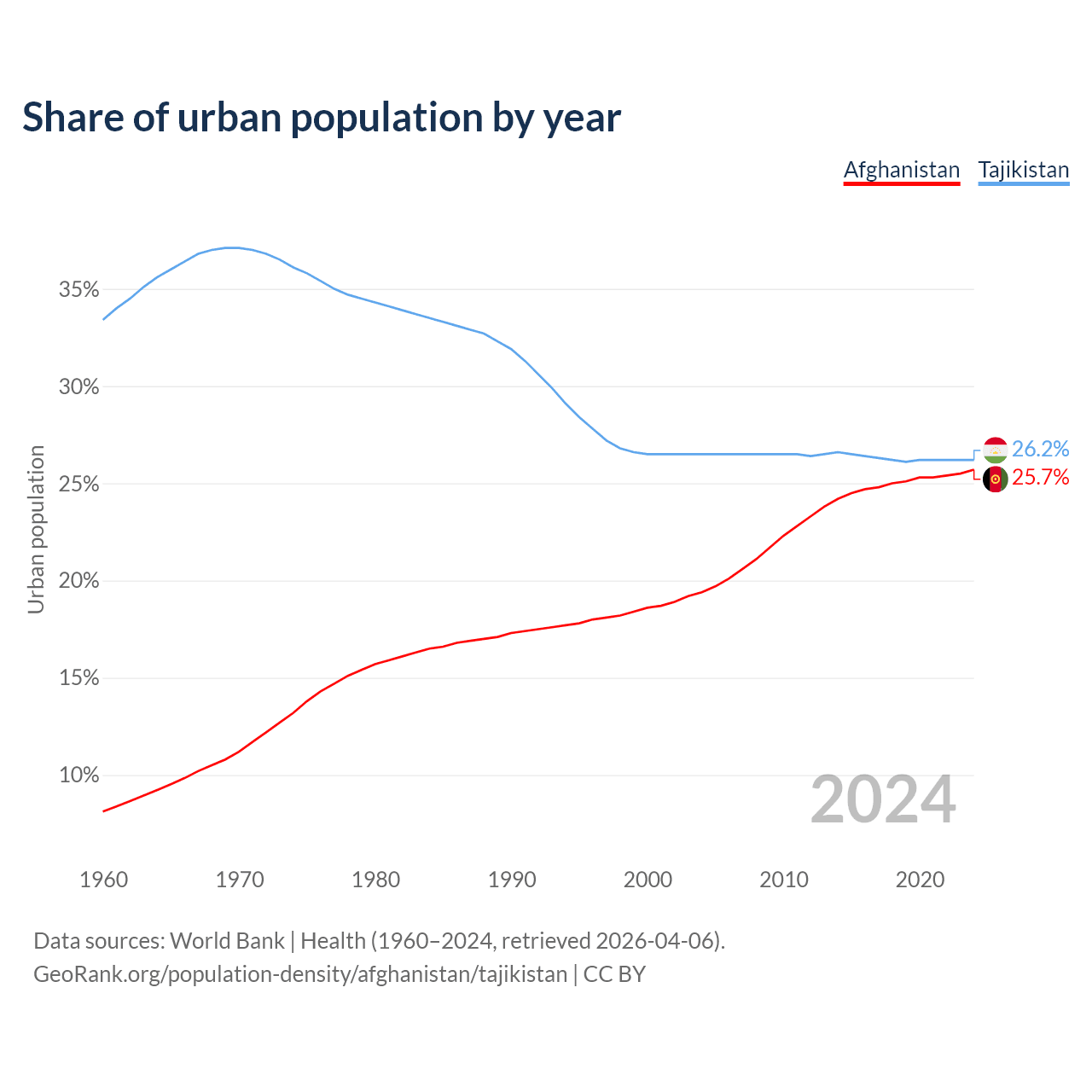 From 2004 to 2024, the share of urban population changed from 19.4% to 25.7% in Afghanistan and from 26.5% to 26.2% in Tajikistan.