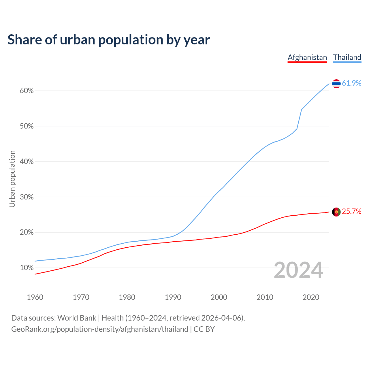 From 2004 to 2024, the share of urban population changed from 19.4% to 25.7% in Afghanistan and from 36.8% to 61.9% in Thailand.