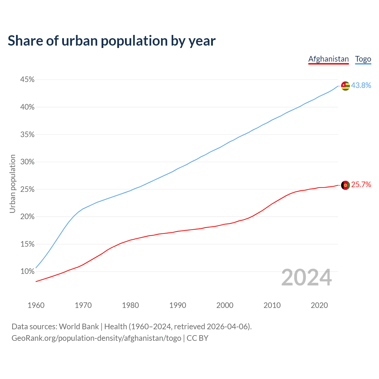 From 2004 to 2024, the share of urban population changed from 19.4% to 25.7% in Afghanistan and from 34.9% to 43.8% in Togo.