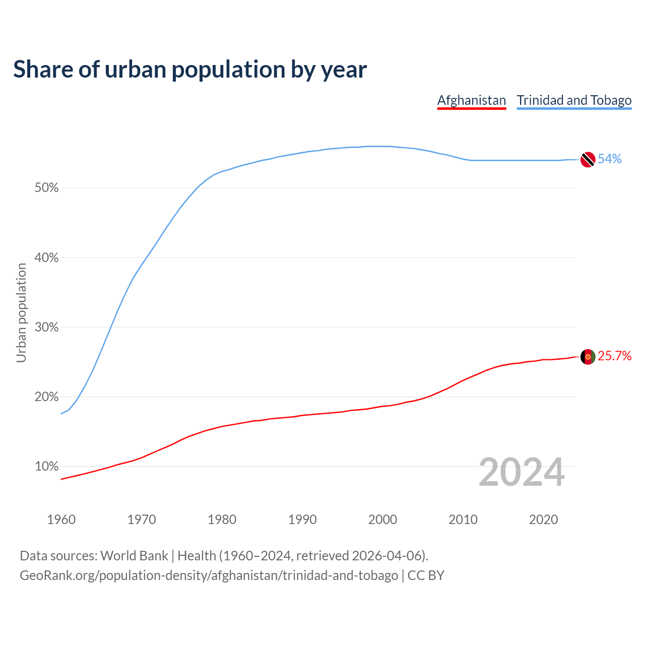 From 2004 to 2024, the share of urban population changed from 19.4% to 25.7% in Afghanistan and from 55.6% to 54% in Trinidad and Tobago.