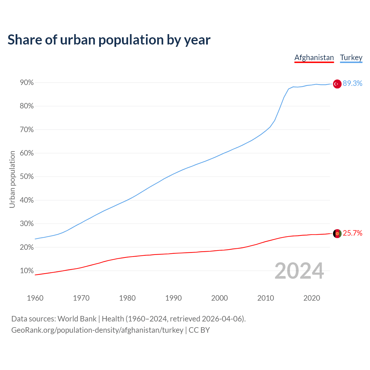 From 2004 to 2024, the share of urban population changed from 19.4% to 25.7% in Afghanistan and from 62.4% to 89.3% in Turkey.