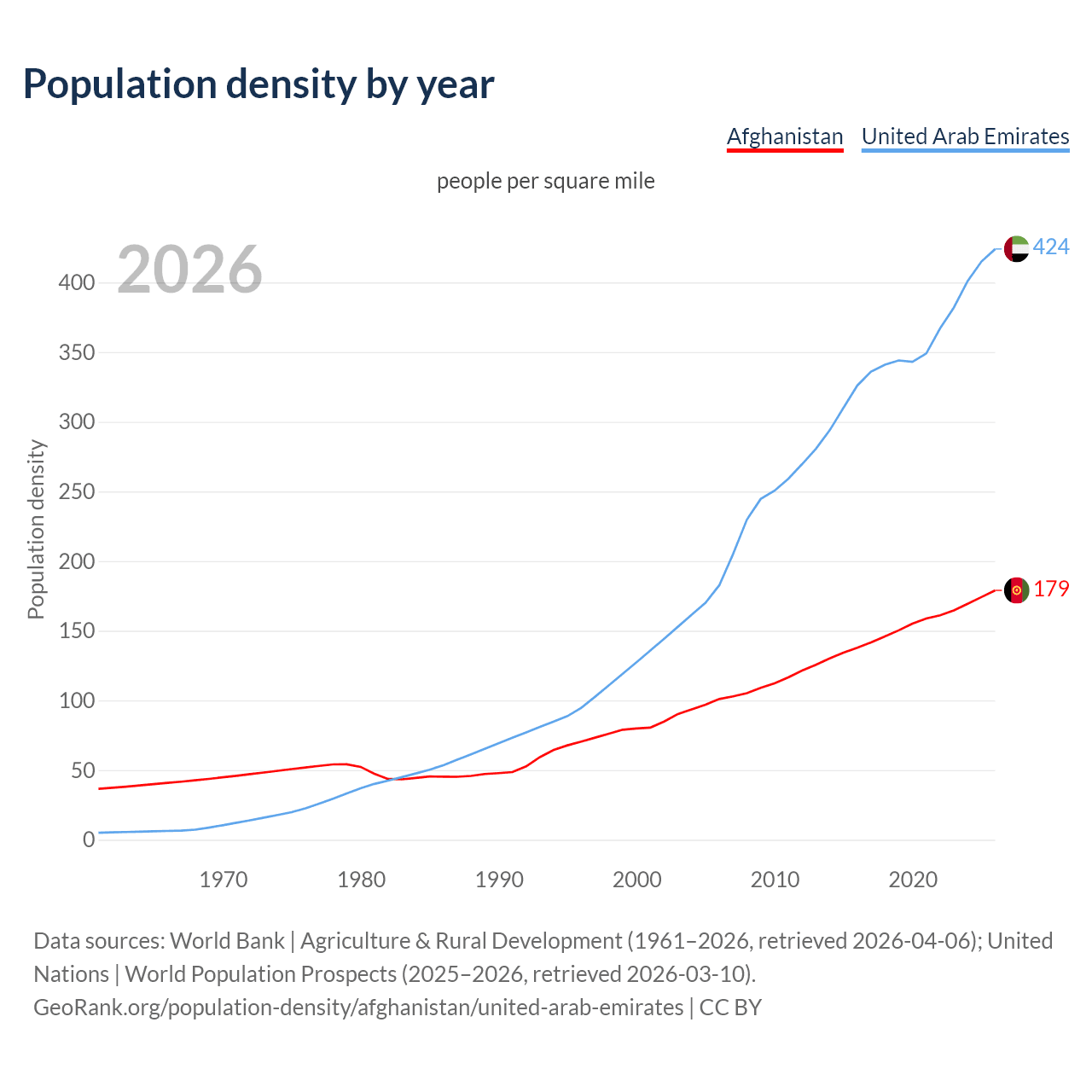 From 2006 to 2026, population density in Afghanistan increased by 77.3%, compared to a 132.2% growth in the United Arab Emirates.
