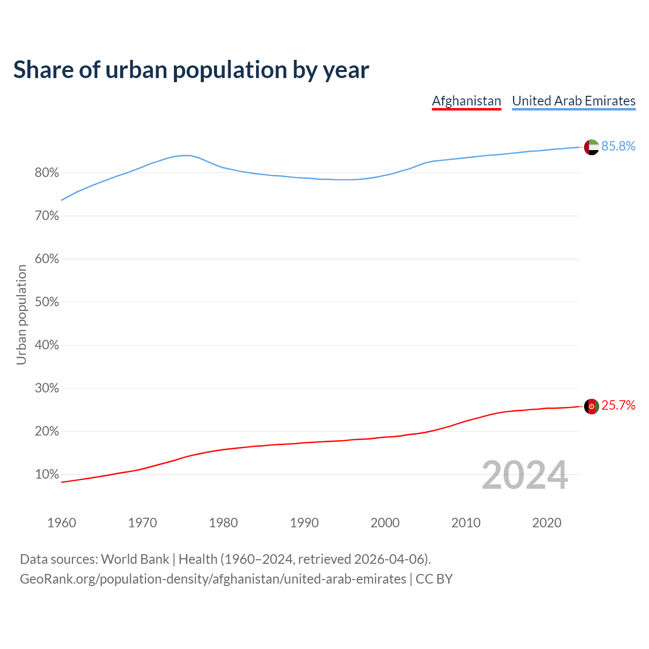 From 2004 to 2024, the share of urban population changed from 19.4% to 25.7% in Afghanistan and from 81.5% to 85.8% in the United Arab Emirates.
