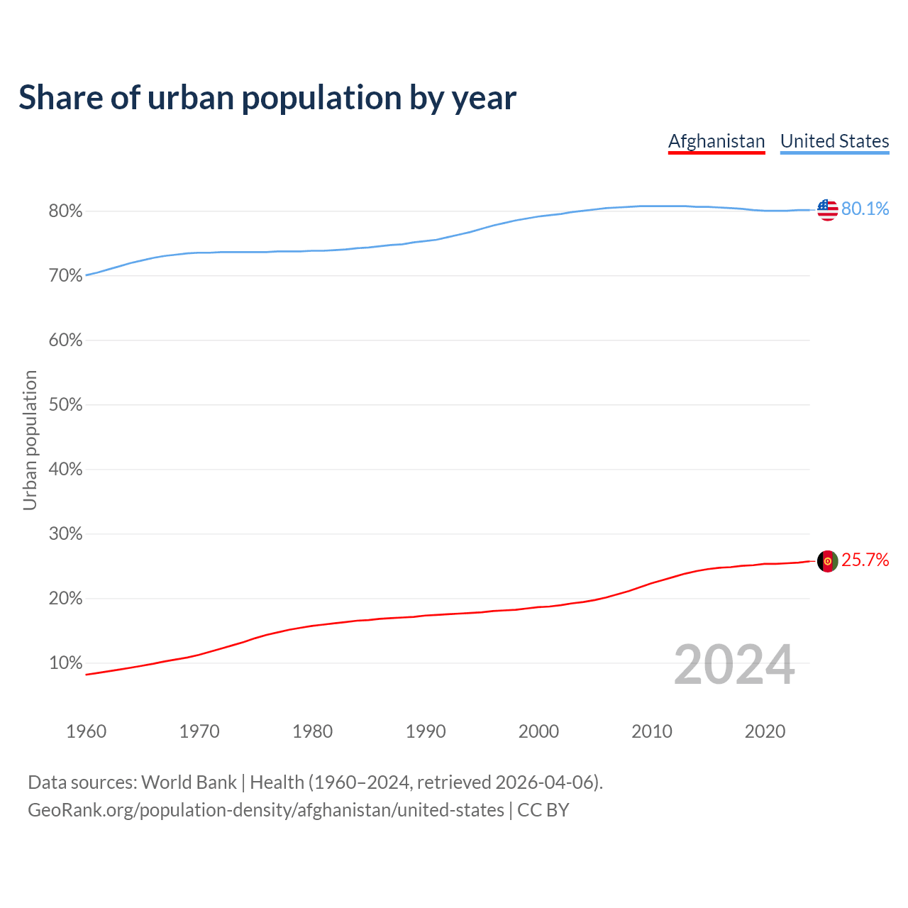 From 2004 to 2024, the share of urban population changed from 19.4% to 25.7% in Afghanistan and from 80% to 80.1% in the United States.