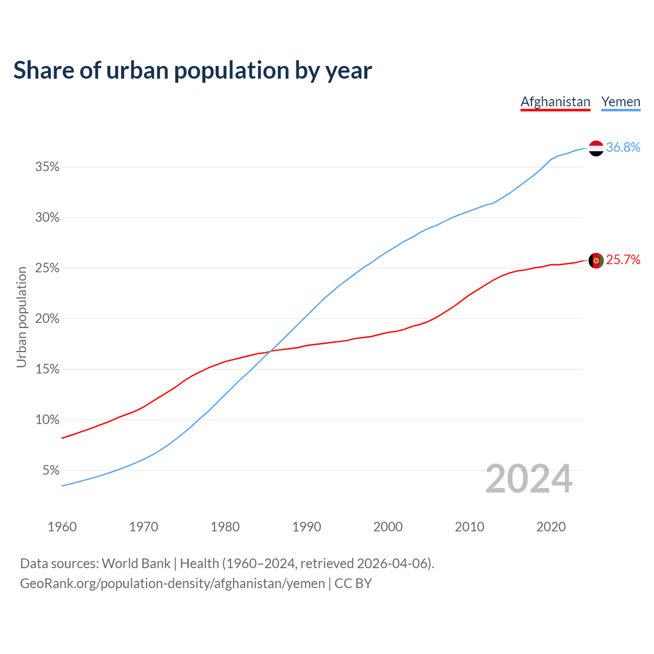 From 2004 to 2024, the share of urban population changed from 19.4% to 25.7% in Afghanistan and from 28.5% to 36.8% in Yemen.
