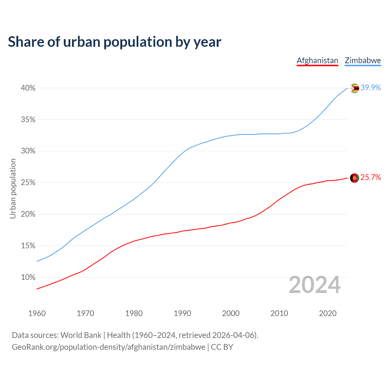 From 2004 to 2024, the share of urban population changed from 19.4% to 25.7% in Afghanistan and from 32.6% to 39.9% in Zimbabwe.
