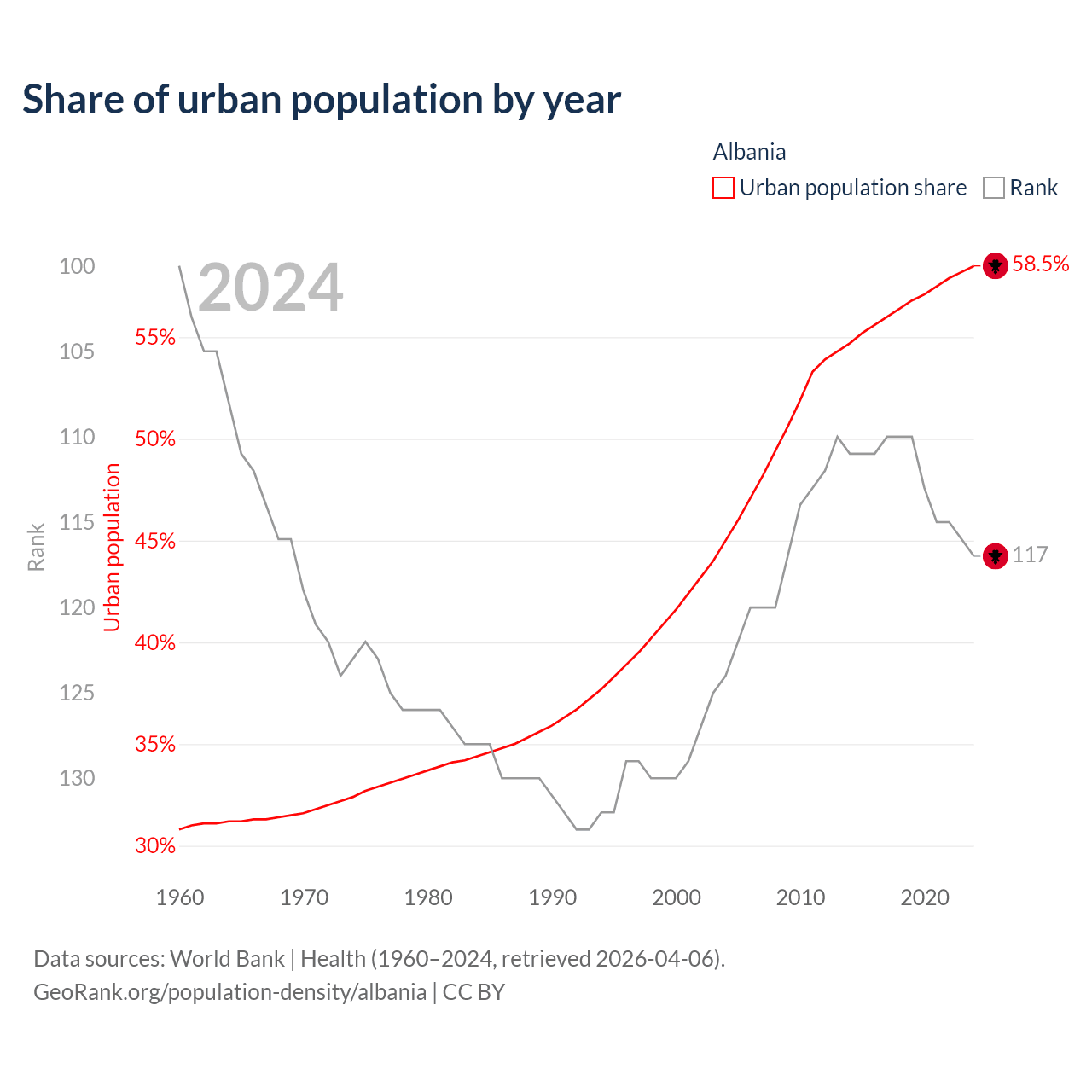 This chart shows the share of urban population in Albania from 1960 to 2024: 30.8% lived in urban areas in 1960, 41.6% in 2000, and 58.5% in 2024.