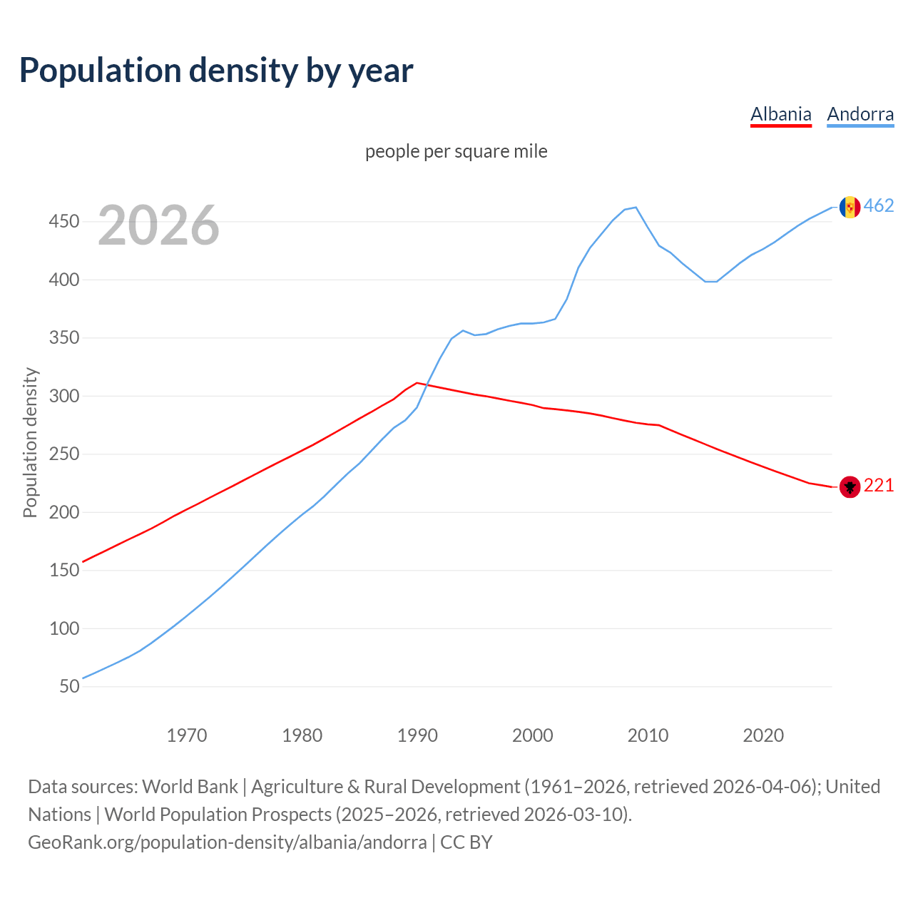 From 2006 to 2026, population density in Albania decreased by 21.7%, compared to a 5.4% growth in Andorra.