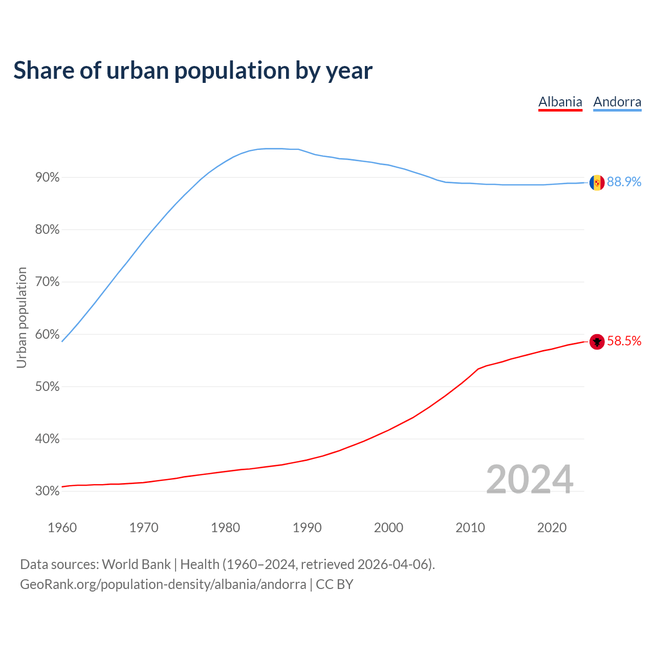 From 2004 to 2024, the share of urban population changed from 45% to 58.5% in Albania and from 90.5% to 88.9% in Andorra.
