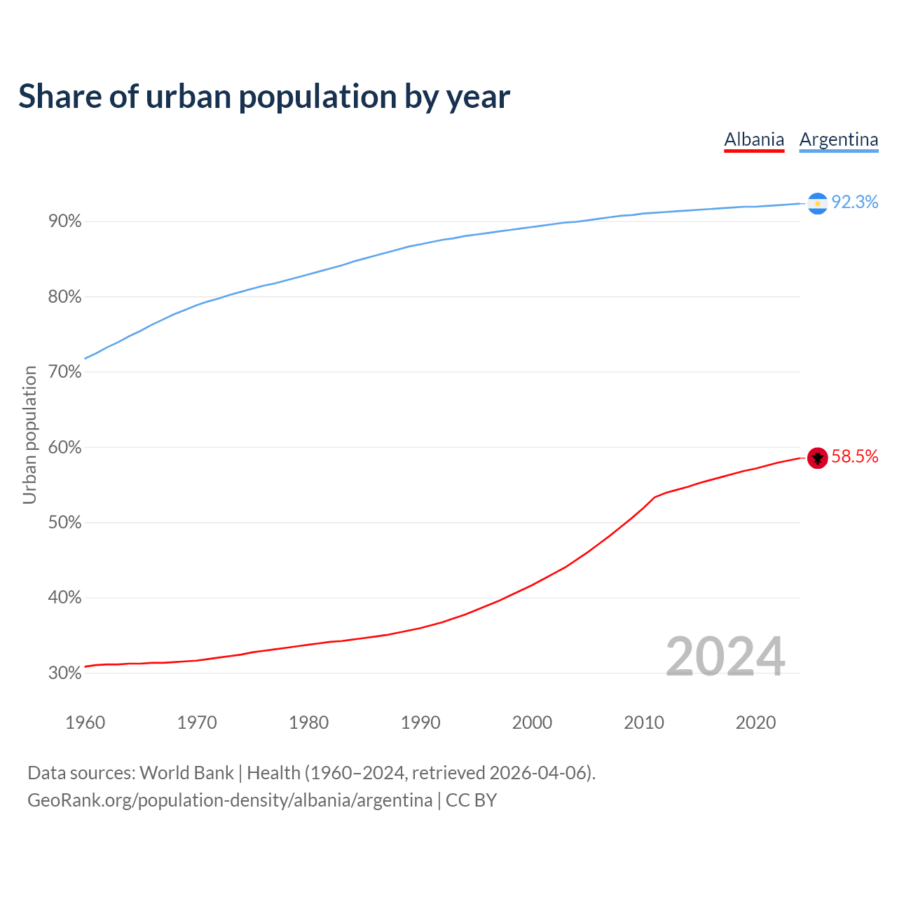 From 2004 to 2024, the share of urban population changed from 45% to 58.5% in Albania and from 89.9% to 92.3% in Argentina.