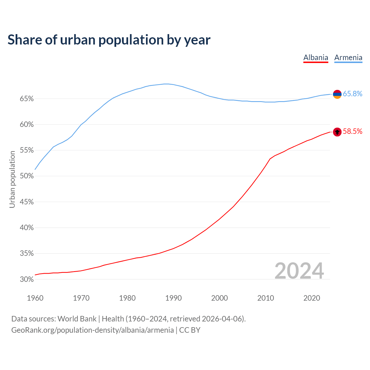 From 2004 to 2024, the share of urban population changed from 45% to 58.5% in Albania and from 64.6% to 65.8% in Armenia.
