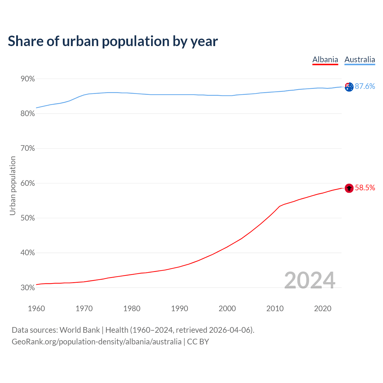 From 2004 to 2024, the share of urban population changed from 45% to 58.5% in Albania and from 85.5% to 87.6% in Australia.