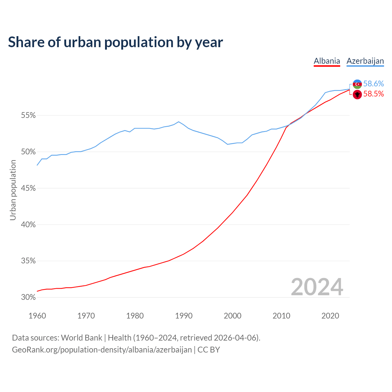 From 2004 to 2024, the share of urban population changed from 45% to 58.5% in Albania and from 52.3% to 58.6% in Azerbaijan.