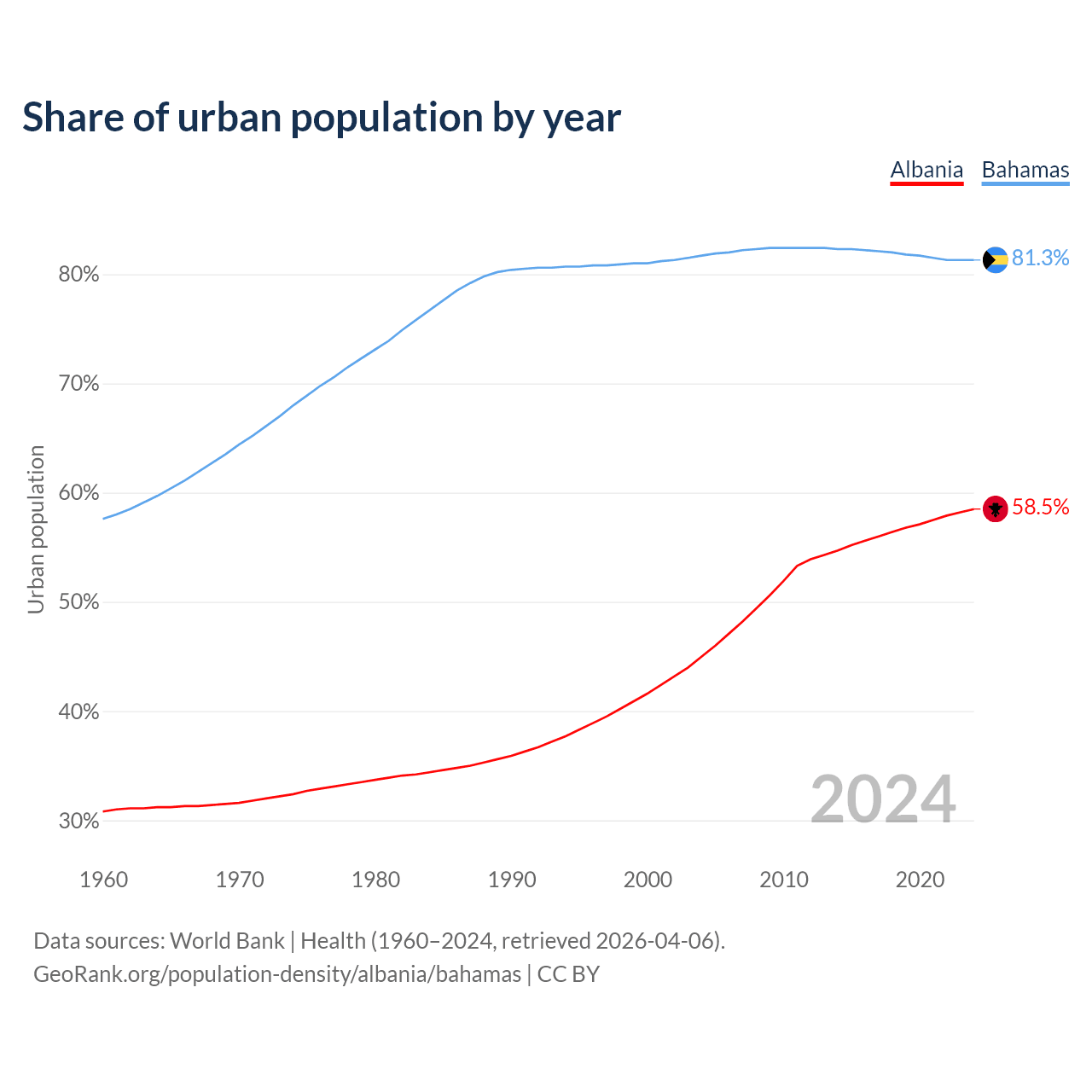 From 2004 to 2024, the share of urban population changed from 45% to 58.5% in Albania and from 81.7% to 81.3% in the Bahamas.