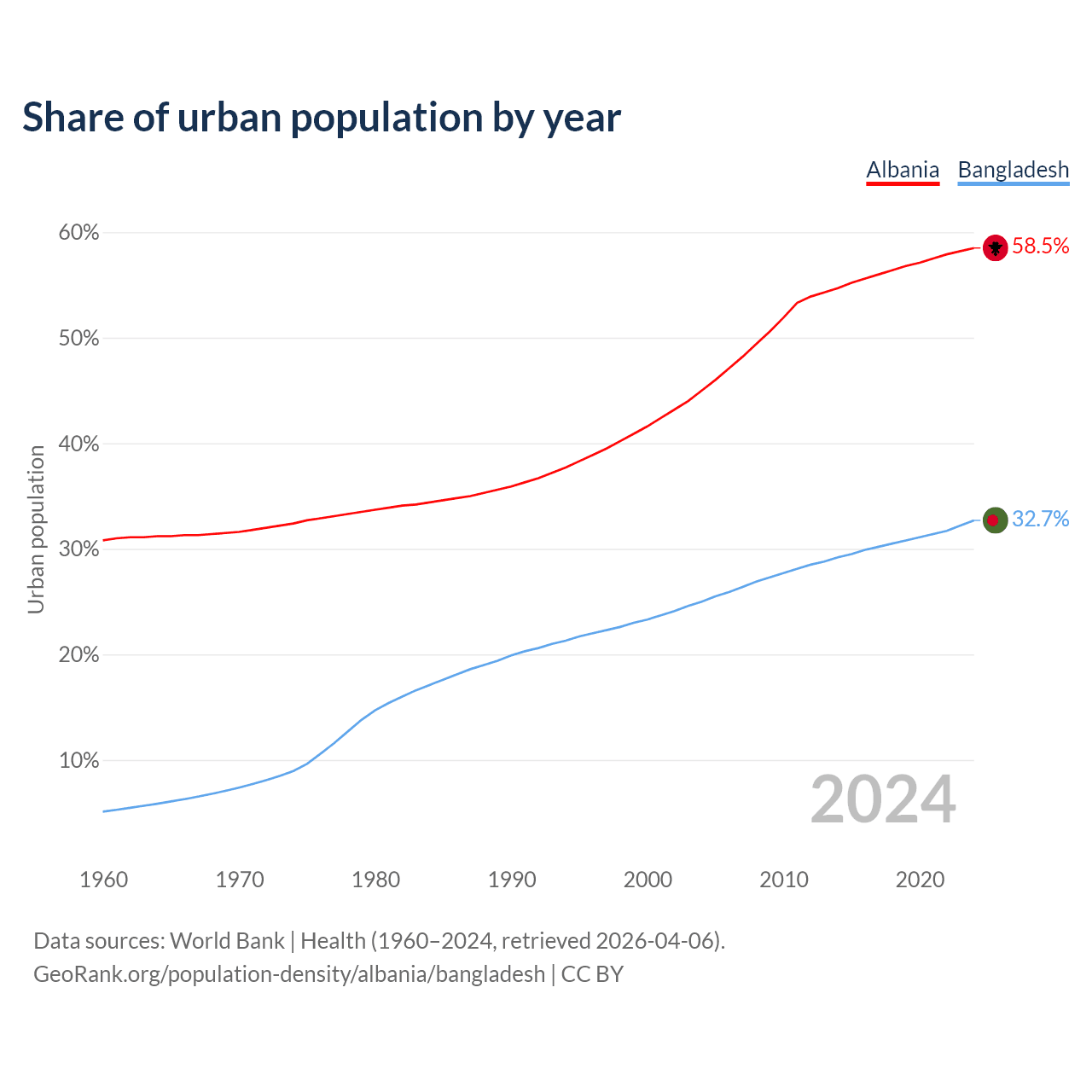 From 2004 to 2024, the share of urban population changed from 45% to 58.5% in Albania and from 25% to 32.7% in Bangladesh.