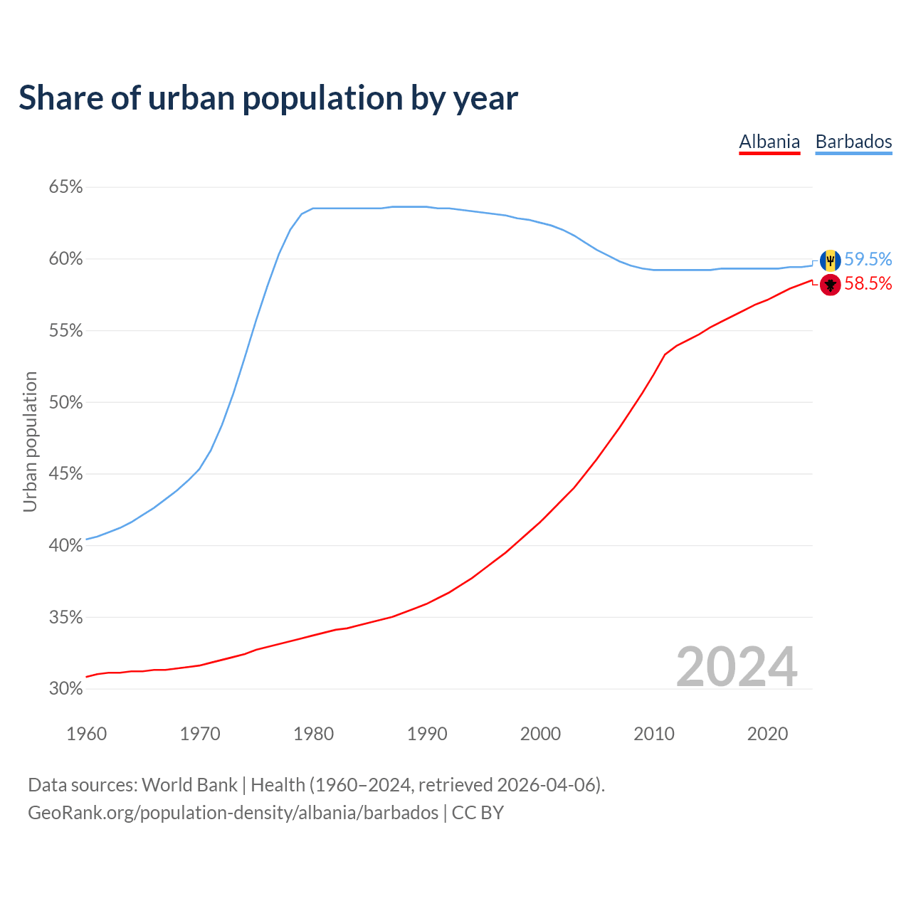 From 2004 to 2024, the share of urban population changed from 45% to 58.5% in Albania and from 61.1% to 59.5% in Barbados.