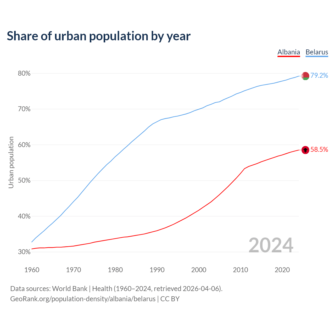 From 2004 to 2024, the share of urban population changed from 45% to 58.5% in Albania and from 71.8% to 79.2% in Belarus.