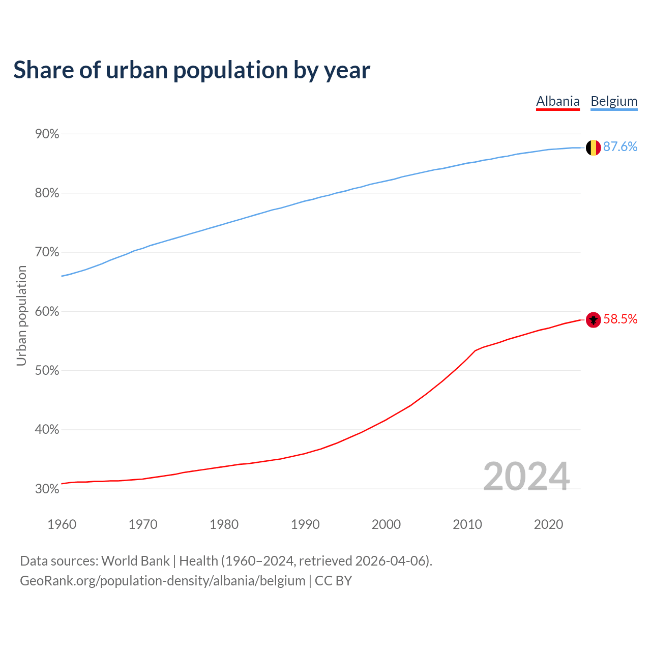 From 2004 to 2024, the share of urban population changed from 45% to 58.5% in Albania and from 83.3% to 87.6% in Belgium.