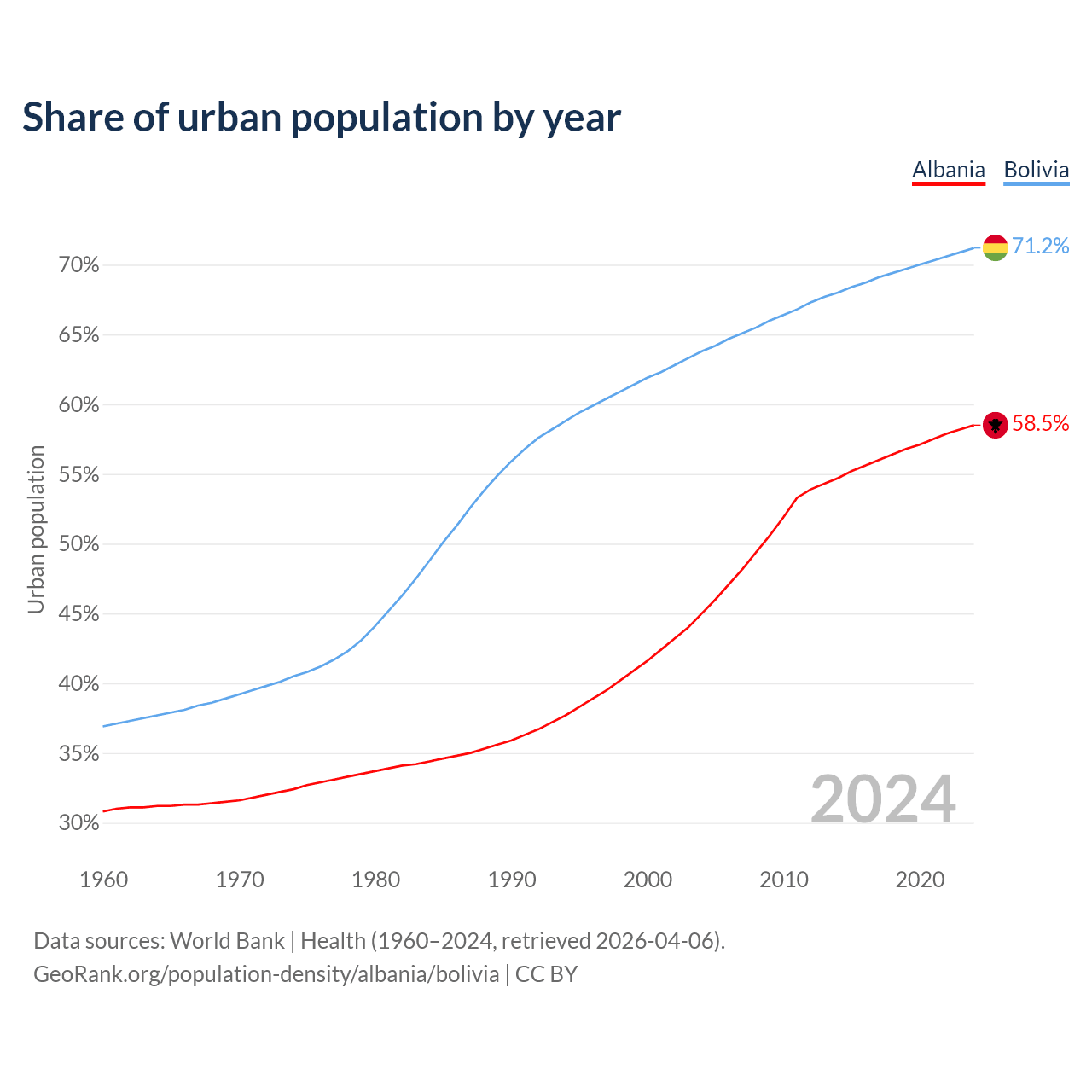 From 2004 to 2024, the share of urban population changed from 45% to 58.5% in Albania and from 63.8% to 71.2% in Bolivia.