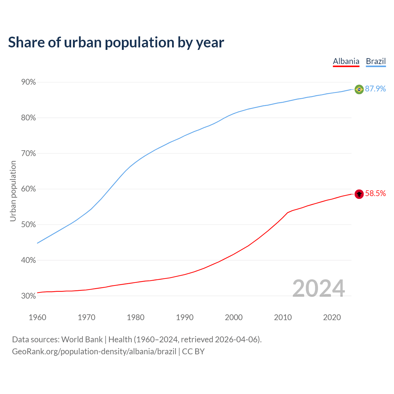From 2004 to 2024, the share of urban population changed from 45% to 58.5% in Albania and from 82.7% to 87.9% in Brazil.
