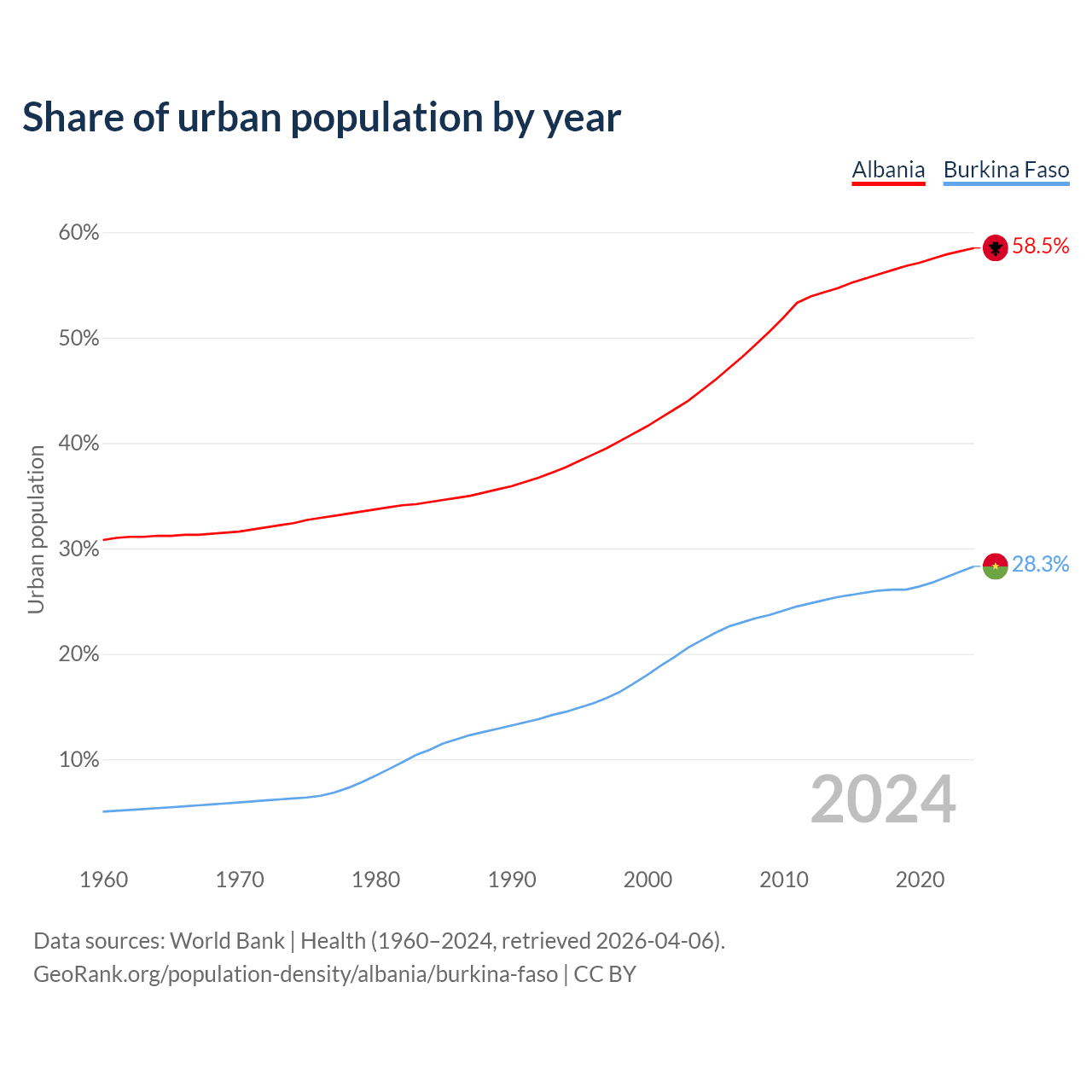 From 2004 to 2024, the share of urban population changed from 45% to 58.5% in Albania and from 21.3% to 28.3% in Burkina Faso.