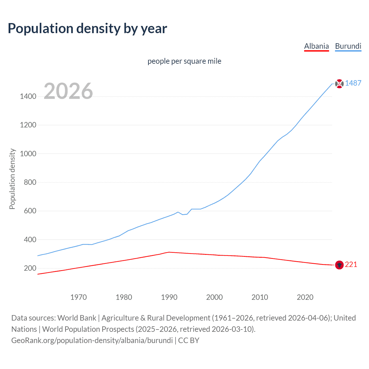From 2006 to 2026, population density in Albania decreased by 21.7%, compared to a 87.4% growth in Burundi.
