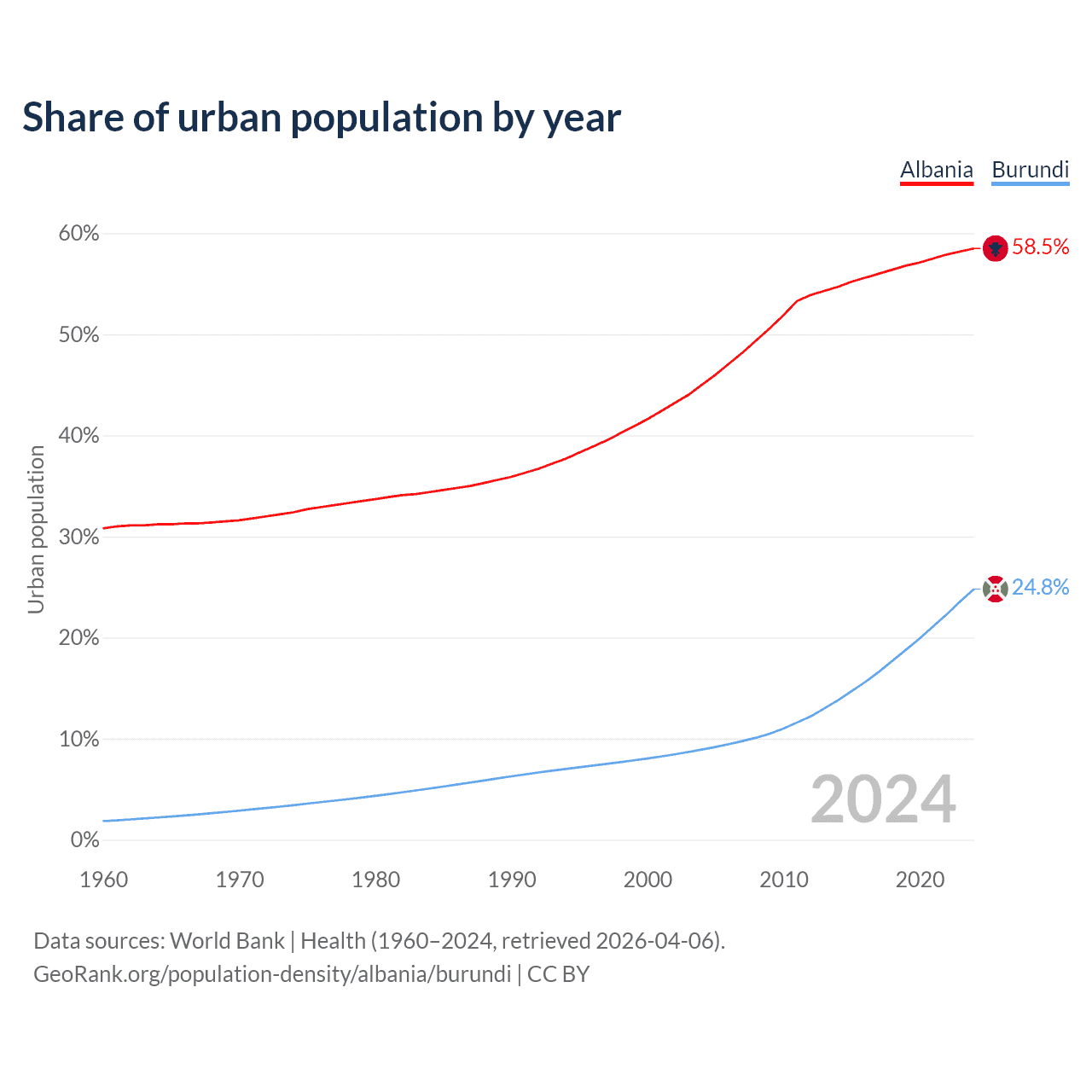 From 2004 to 2024, the share of urban population changed from 45% to 58.5% in Albania and from 8.92% to 24.8% in Burundi.
