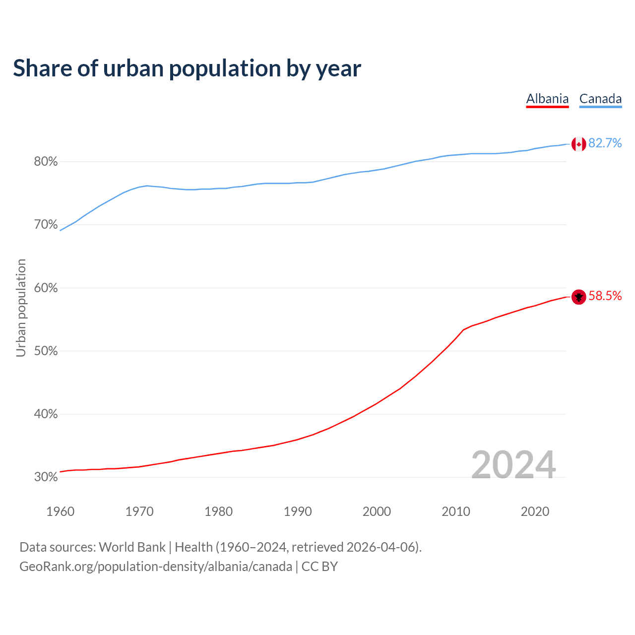 From 2004 to 2024, the share of urban population changed from 45% to 58.5% in Albania and from 79.7% to 82.7% in Canada.