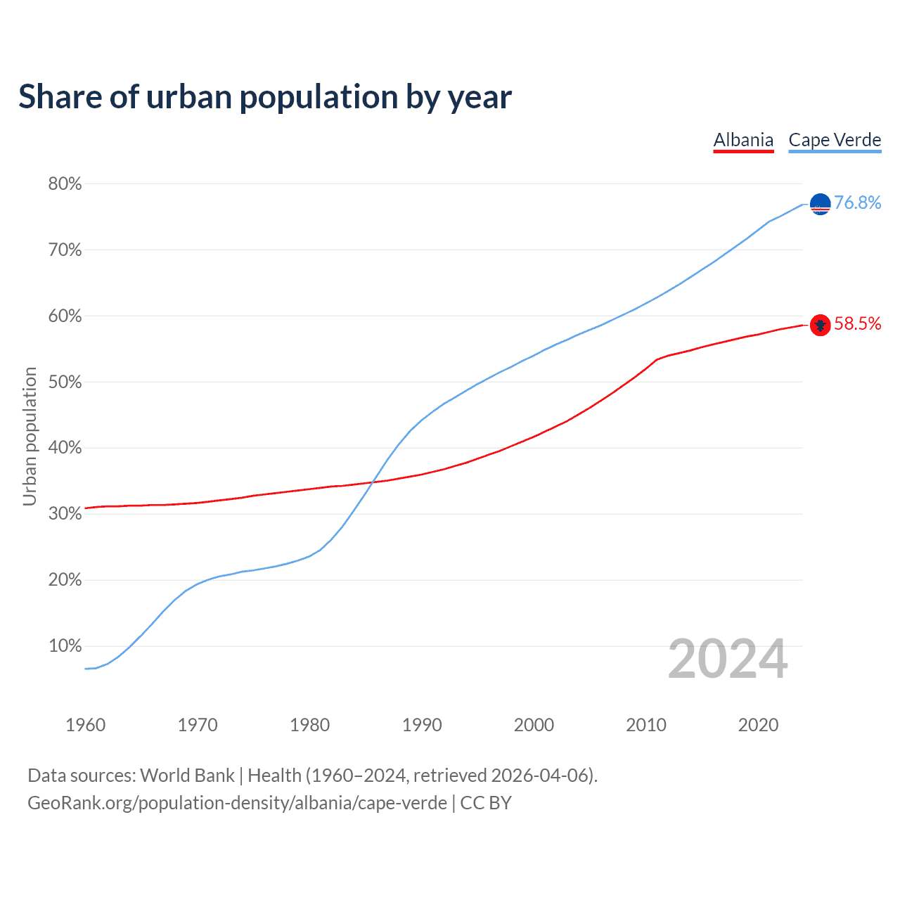 From 2004 to 2024, the share of urban population changed from 45% to 58.5% in Albania and from 57.1% to 76.8% in Cape Verde.