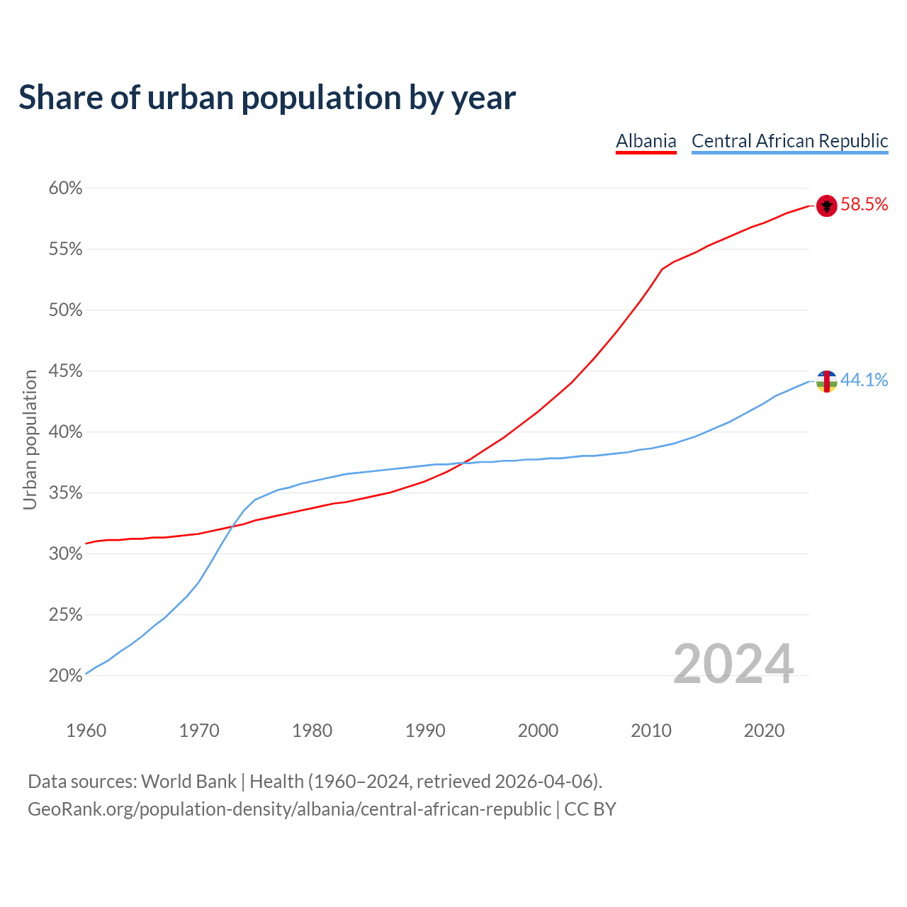 From 2004 to 2024, the share of urban population changed from 45% to 58.5% in Albania and from 38% to 44.1% in the Central African Republic.