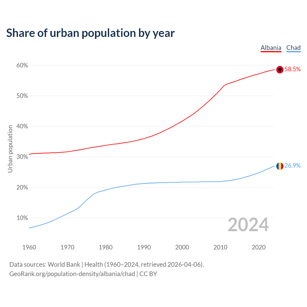 From 2004 to 2024, the share of urban population changed from 45% to 58.5% in Albania and from 21.7% to 26.9% in Chad.