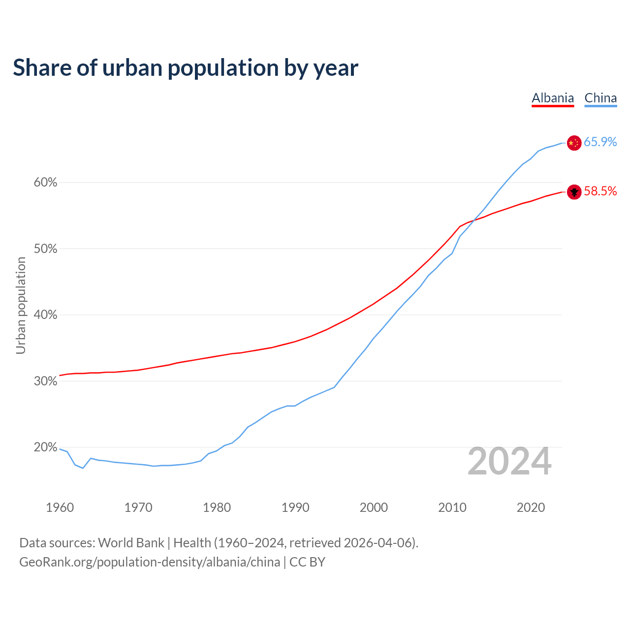 From 2004 to 2024, the share of urban population changed from 45% to 58.5% in Albania and from 41.8% to 65.9% in China.