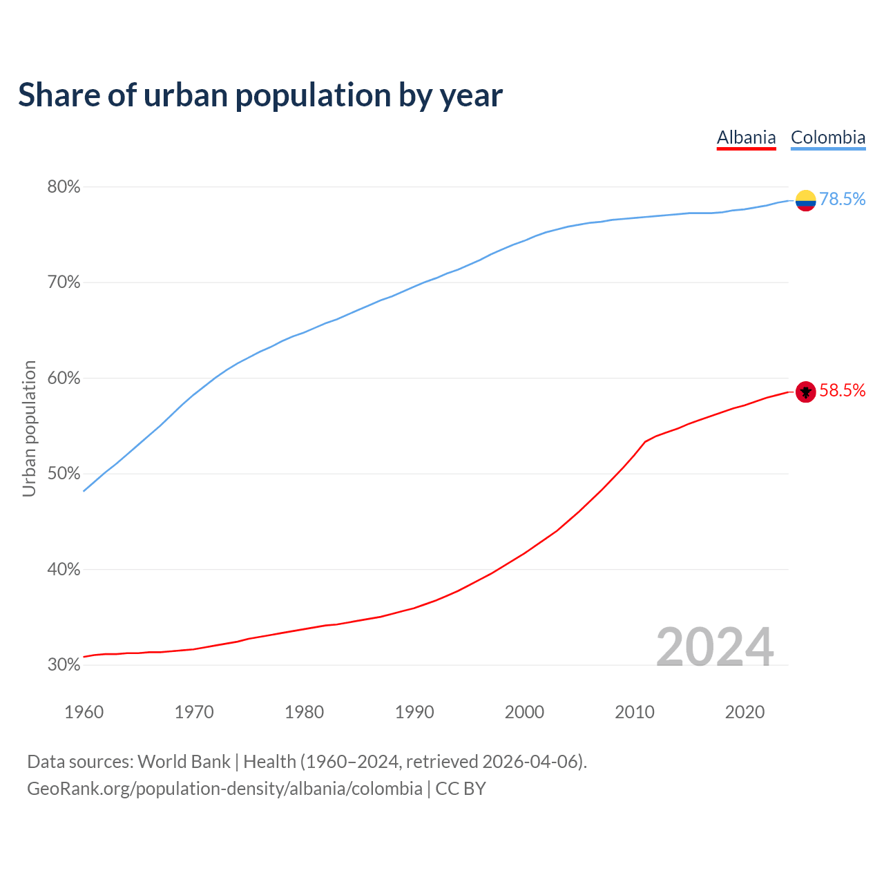 From 2004 to 2024, the share of urban population changed from 45% to 58.5% in Albania and from 75.8% to 78.5% in Colombia.