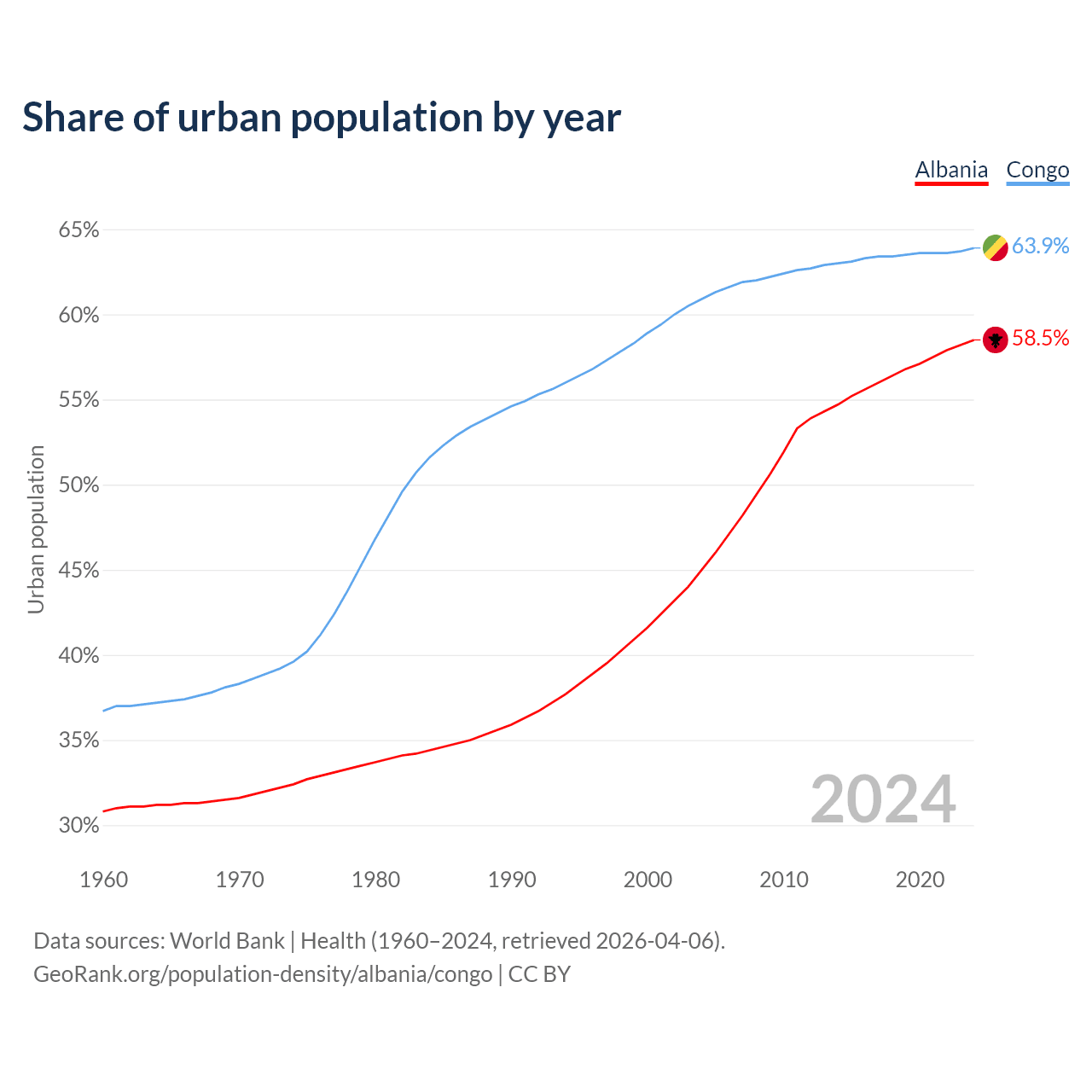 From 2004 to 2024, the share of urban population changed from 45% to 58.5% in Albania and from 60.9% to 63.9% in the Congo.